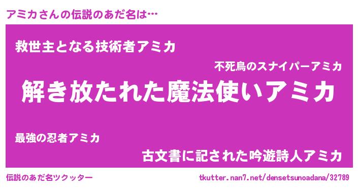 | ヒーロー風カッコイイあだ名 | 『ウルトラ戦士アミカ』『天弓騎士アミ』 |