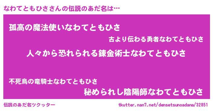 | 男性向けラノベタイトル風あだ名 | 『魔弾の王となわてともひさ』 |