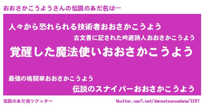 | 男性向けラノベタイトル風あだ名 | 『おおさかこうよう~年齢イコール彼女いない歴の魔法使い~』 |