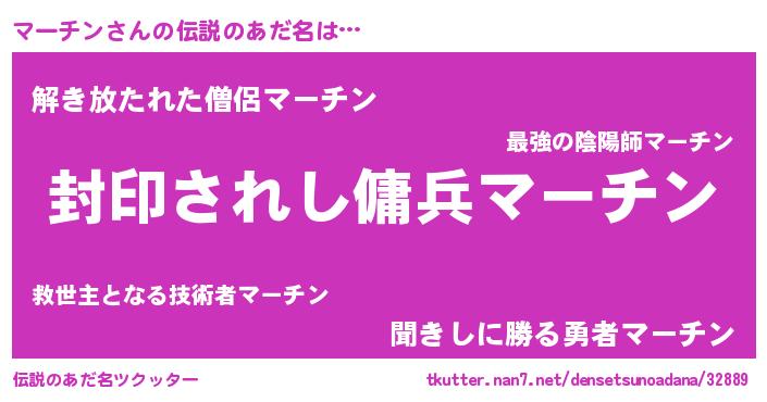 | 男性向けラノベタイトル風あだ名 | 『マーチン~年齢イコール彼女いない歴の魔法使い~』 |