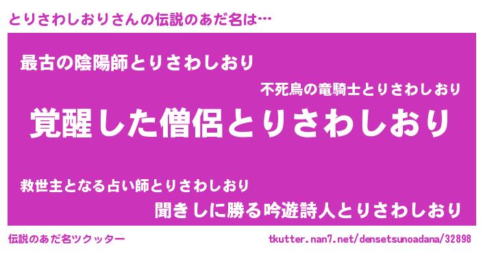 | 男性向けラノベタイトル風あだ名 | 『Re:とりさわしおりから始める異世界生活』 |
