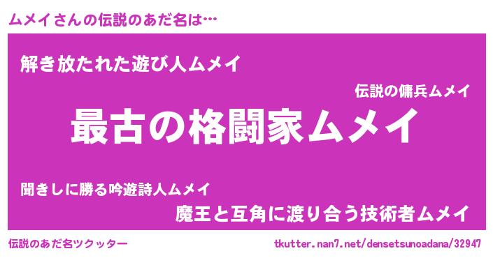 | 意味不明あだ名 | 『自称ムメイ』『めかぶ科ムメイ属』 |