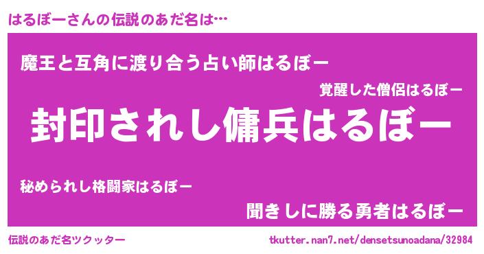 | 男性向けラノベタイトル風あだ名 | 『ハルボーアートオンライン』 |