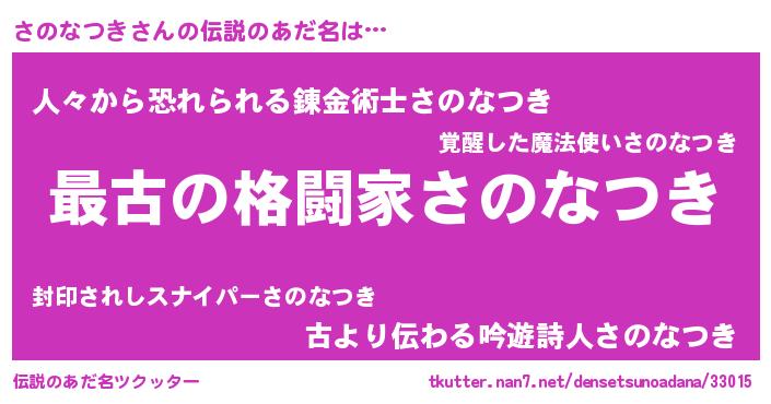 | 男性向けラノベタイトル風あだ名 | 『冴えないさのなつきの育てかた』 |