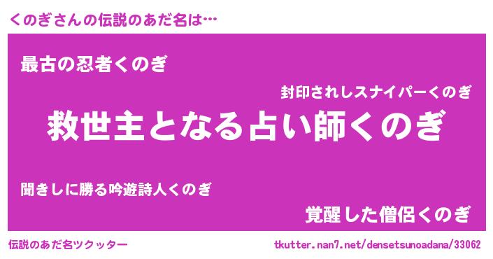 | 男性向けラノベタイトル風あだ名 | 『くのぎに滅ぼされるだけの簡単なお仕事です』 |