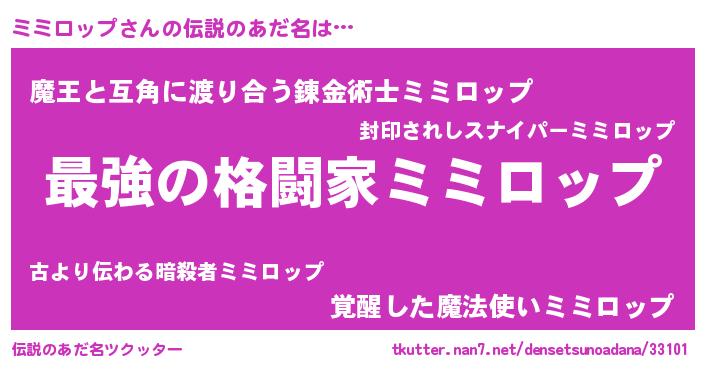 | 男性向けラノベタイトル風あだ名 | 『ミミロップ~年齢イコール彼女いない歴の魔法使い~』 |