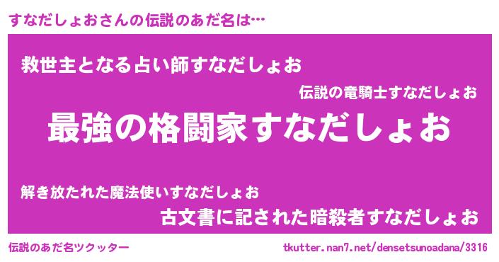 | 男性向けラノベタイトル風あだ名 | 『Re:すなだしょおから始める異世界生活』 |