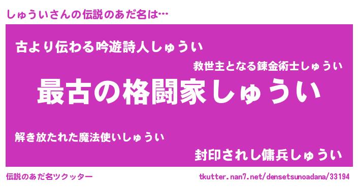 | ヒーロー風カッコイイあだ名 | 『仮面シュダー』『超時空戦士シュウイ』 |