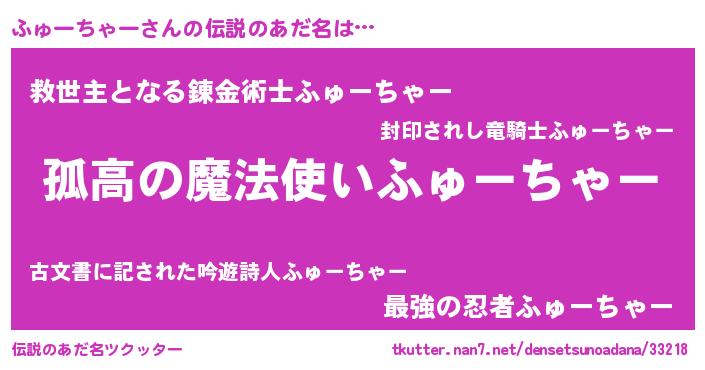 | 胡散臭い通販商品みたいなあだ名 | 『信頼と実績のサプリメント…その名も「ふゅーちゃー」』 |