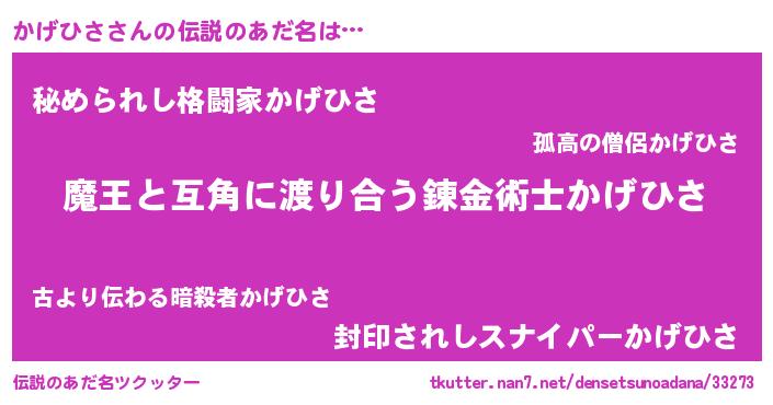 | 男性向けラノベタイトル風あだ名 | 『おまえをオタクにしてやるから、俺をかげひさにしてくれ! 』 |