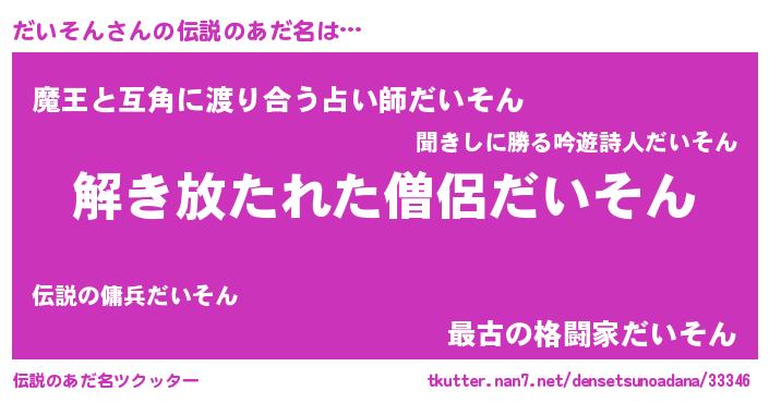 | 男性向けラノベタイトル風あだ名 | 『だいそんに滅ぼされるだけの簡単なお仕事です』 |