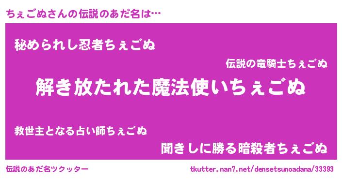| 女子向けラノベタイトル風あだ名 | 『ちぇごぬの卵を拾いまして』 |