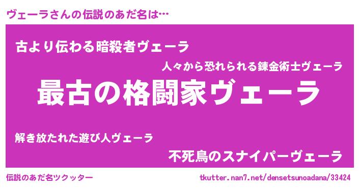 | 男性向けラノベタイトル風あだ名 | 『転生したらヴェーラだった件』 |