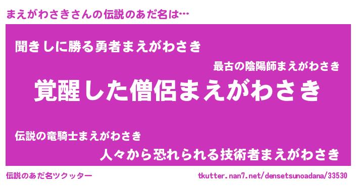 | 男性向けラノベタイトル風あだ名 | 『まえがわさきの嫁は女の子じゃないと思った?』 |