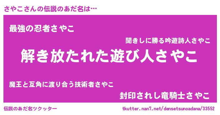 | ヒーロー風カッコイイあだ名 | 『魔戒騎士サヤ』『ウルトラさやこマン』 |
