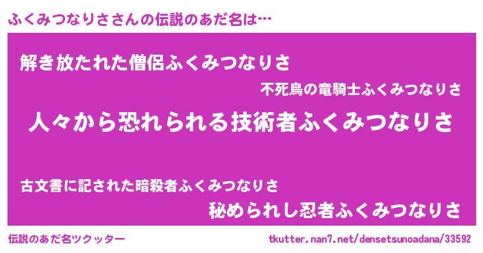 | 意味不明あだ名 | 『住所不定無職ふくみつなりさ(1歳)』 |