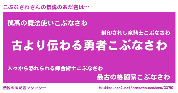 | 男性向けラノベタイトル風あだ名 | 『こぶなさわに滅ぼされるだけの簡単なお仕事です』 |