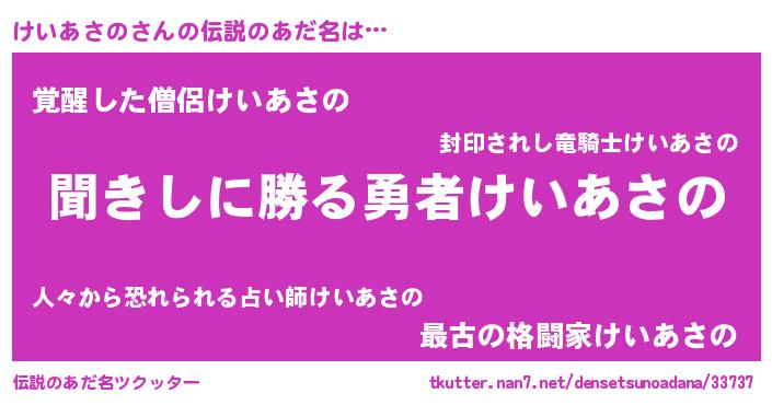 | 意味不明あだ名 | 『永久保存けいあさの』『自称けいあさの』 |