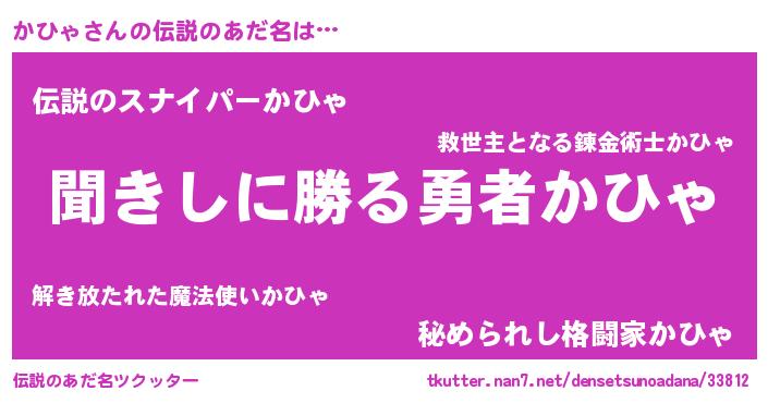| 男性向けラノベタイトル風あだ名 | 『カヒャスレイヤー』『魔弾の王とかひゃ』 |