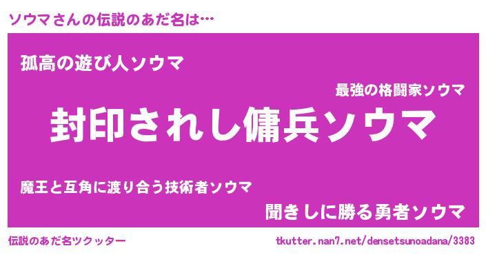 | 男性向けラノベタイトル風あだ名 | 『ソウマ~年齢イコール彼女いない歴の魔法使い~』 |