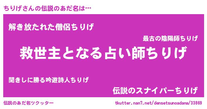 | ヒーロー風カッコイイあだ名 | 『仮面チリダー』『ウルトラ戦士チリゲ』 |