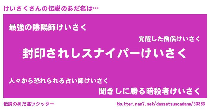 | 男性向けラノベタイトル風あだ名 | 『けいさく~年齢イコール彼女いない歴の魔法使い~』 |