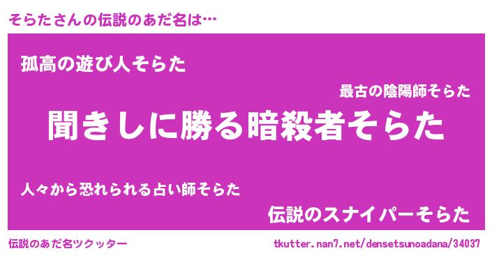 | 男性向けラノベタイトル風あだ名 | 『魔弾の王とそらた』 |