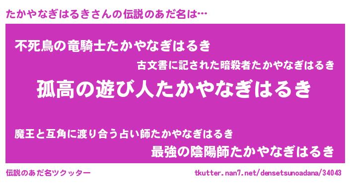 | 胡散臭い通販商品みたいなあだ名 | 『信頼と実績のペンダント…その名も「たかやなぎはるき」』 |