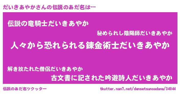 | 男性向けラノベタイトル風あだ名 | 『おまえをオタクにしてやるから、俺をだいきあやかにしてくれ! 』 |