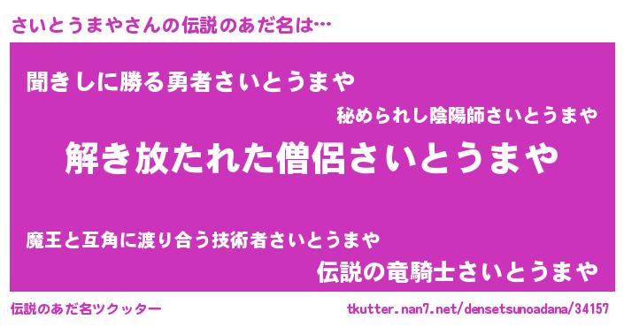| 男性向けラノベタイトル風あだ名 | 『転生したらさいとうまやだった件』 |