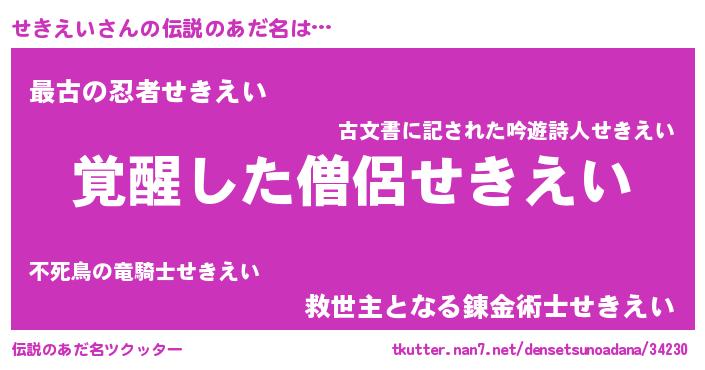 | 男性向けラノベタイトル風あだ名 | 『せきえい~年齢イコール彼女いない歴の魔法使い~』 |
