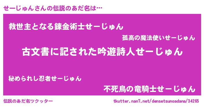 | 男性向けラノベタイトル風あだ名 | 『せーじゅん~年齢イコール彼女いない歴の魔法使い~』 |