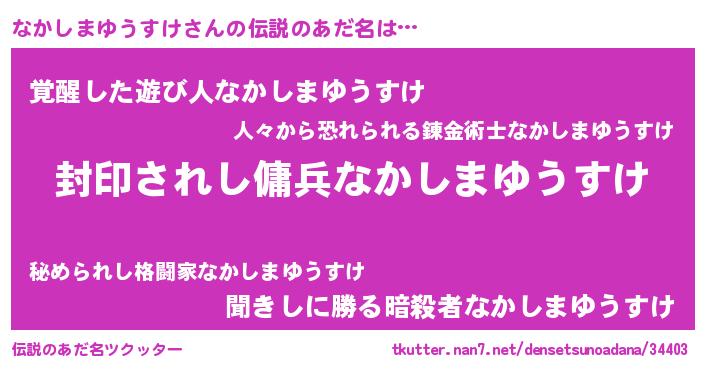 | 女子向けラノベタイトル風あだ名 | 『悪役なかしまゆうすけに転生したようですが、知った事ではありません』 |