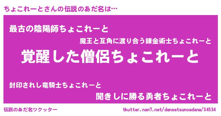 | 男性向けラノベタイトル風あだ名 | 『ちょこれーとの嫁は女の子じゃないと思った?』 |