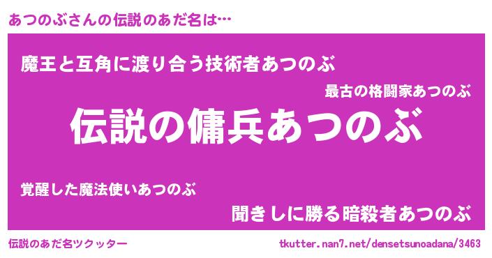 | 男性向けラノベタイトル風あだ名 | 『魔弾の王とあつのぶ』『あつのぶの憂鬱』 |