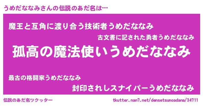 | ヒーロー風カッコイイあだ名 | 『暗黒騎士ウメ』『スーパーウメダナナミ』 |