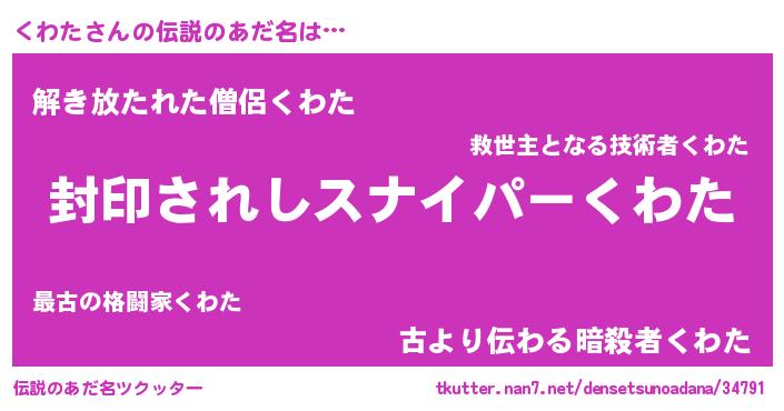 | 男性向けラノベタイトル風あだ名 | 『この素晴らしい世界にくわたを!』 |