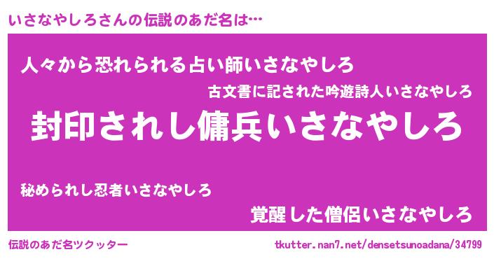 | ヒーロー風カッコイイあだ名 | 『スーパーイサナヤシロ』『銀牙騎士イサ』 |