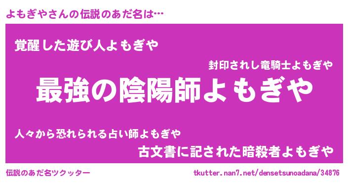 | 男性向けラノベタイトル風あだ名 | 『よもぎや~年齢イコール彼女いない歴の魔法使い~』 |