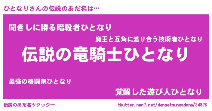 | 男性向けラノベタイトル風あだ名 | 『ひとなりの憂鬱』『魔弾の王とひとなり』 |