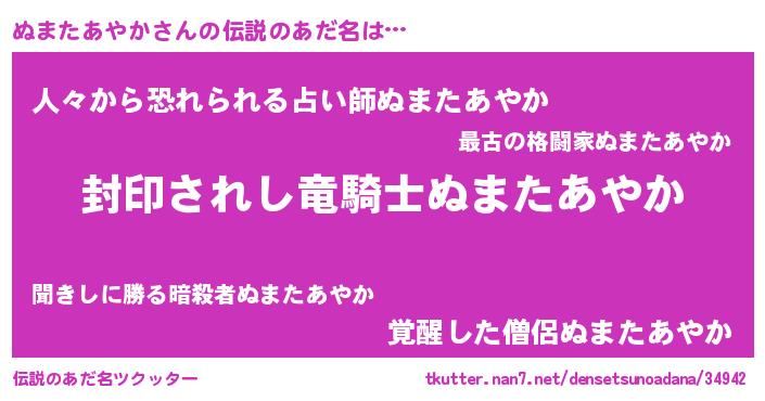| 男性向けラノベタイトル風あだ名 | 『ヌマタアヤカアートオンライン』 |