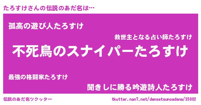 | 男性向けラノベタイトル風あだ名 | 『たろすけの憂鬱』『魔弾の王とたろすけ』 |