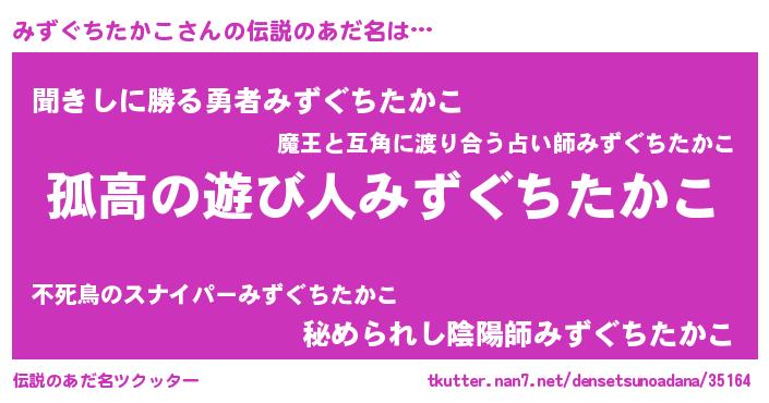 | 男性向けラノベタイトル風あだ名 | 『ダンジョンにみずぐちたかこを求めるのは間違っているだろうか』 |