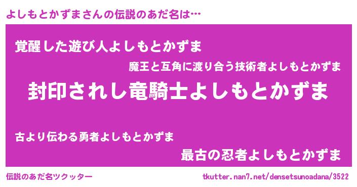| 男性向けラノベタイトル風あだ名 | 『うちのよしもとかずまが世界を掌握している!』 |