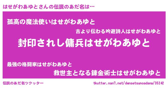 | 男性向けラノベタイトル風あだ名 | 『ハセガワアユトアートオンライン』 |
