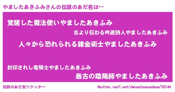 | 男性向けラノベタイトル風あだ名 | 『おまえをオタクにしてやるから、俺をやましたあきふみにしてくれ! 』 |