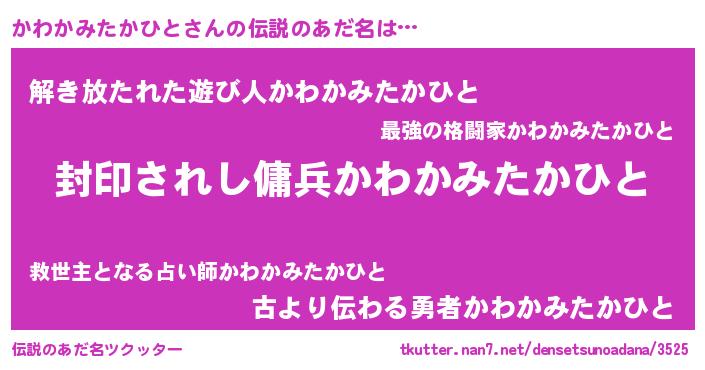 | ヒーロー風カッコイイあだ名 | 『スーパーカワカミタカヒト』 |