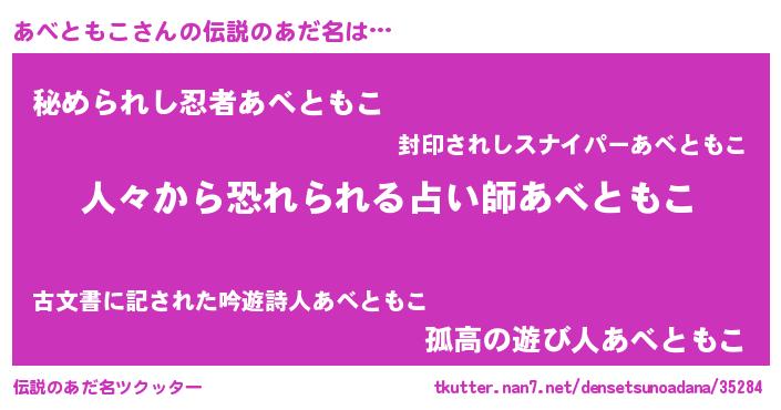 | ヒーロー風カッコイイあだ名 | 『仮面アベダー』『最強戦士アベトモコ』 |