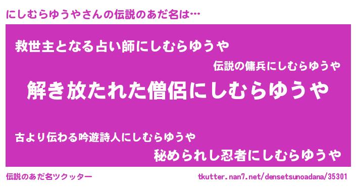 | 男性向けラノベタイトル風あだ名 | 『にしむらゆうやの嫁は女の子じゃないと思った?』 |