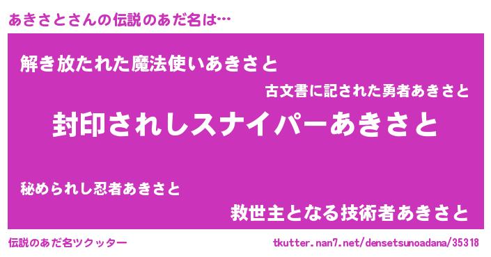 | ヒーロー風カッコイイあだ名 | 『スーパーアキサト』『銀牙騎士アキ』 |
